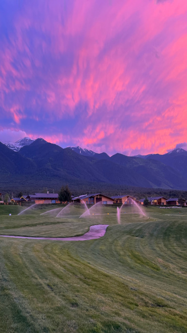 Гледката към голф игрището и планинските върхове навява усещане за простор и свобода още с влизането. Просторният хол с камина ви приканва да се сгушите с книга или в разговор, а големите прозорци отварят дома към светлина и природа. Дървените акценти, естествените материали и топлата цветова палитра създават хармония между интериор и пейзаж.